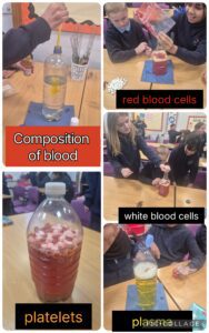 This week the children have been learning about the composition of the blood and had the chance to create a model of the blood representing plasma, red blood cells, white blood cells and platelets in a plastic bottle.